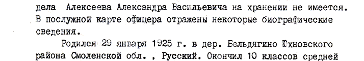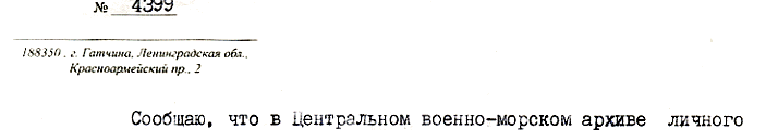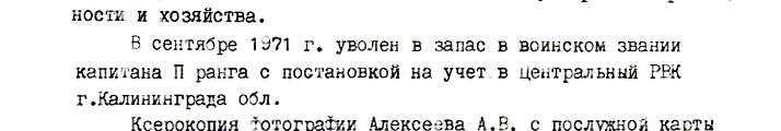 Решил зайти с другой стороны. Связаться с архивом и получить копию личного дела Алексеева. Отписал письмо в ЦВМА (Центральный Военно-Морской Архив РФ, Гатчина). Оказалось, что уже давным-давно никаких справок связанных с обработкой больших объемов архивных документов архив бесплатно не производит. Или платите, или приезжайте сами и копайтесь в архиве. Благодаря старым связям клуба "Садко" таки удалось получить хоть какой-то ответ от архива. Вот он: